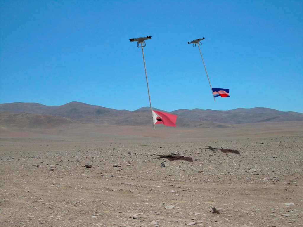 Me encontraba tomando muestras en cierto planeta potencialmente habitable cuando escuché aquel sonido como de alas. Al principio solo vi las sombras errantes, en la superficie rocosa, que por momentos se cruzaban y se perseguían como si recordaran que estaban allí para realizar algún tipo de danza. De repente, aumentaron de tamaño, y a mi campo visual entraron las dos banderas, seguidas de sus astas, y luego las estructuras voladoras a que estaban adheridas. Era como ver la dilución de un atrio, o el vuelo de imposibles aves cuyo acrofóbico plumaje huía.