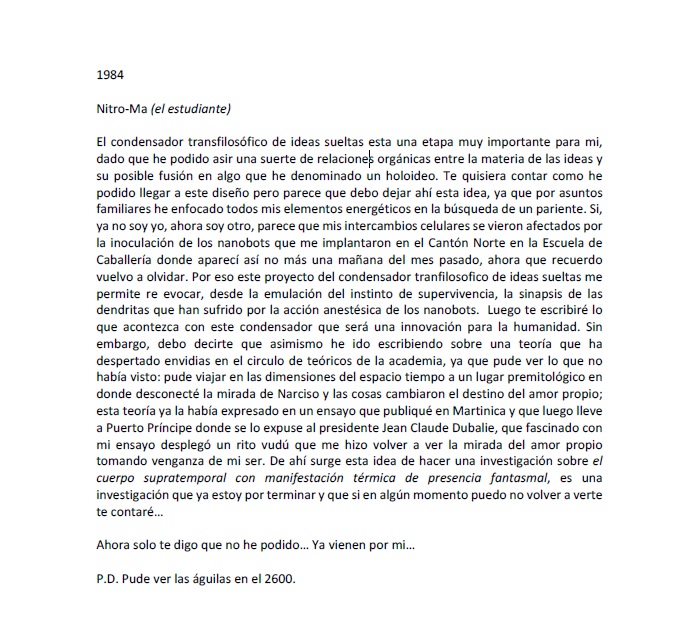 Se refería pues, en su última fantasmagoría, a un desplazamiento, a un itinerario de fuselajes y combustibles atómicos que su propio padre habría diseñado en sus ratos libres con los sobrantes de la construcción del Apolo II. Desconocemos (desconoce F) cómo hizo Castillo Cano para acceder a un posible archivo del progenitor, siendo que este desapareció una ves concluida la misión colombiana en los laboratorios secretos de la NASA, sin dejar rastro o dirección. En fin, de la dicha carta queda como dato clave la intensión del viaje, galáctico por inferencia, a bordo de cierto dispositivo celular. Yo misma me he puesto la tarea de investigar a fondo, preguntarle a los viejos seleccionados que participaron en la primera misión de recuperación ecológica y lingüística del CPI en la Tierra, a ver si saben del caso, no sea que el mítico todero del Bloque Cinco haya partido hacia tierras del CríptidoX, lo cual explicaría la disminución de emisiones fotolingüísticas en el laboratorio de d99nt_.